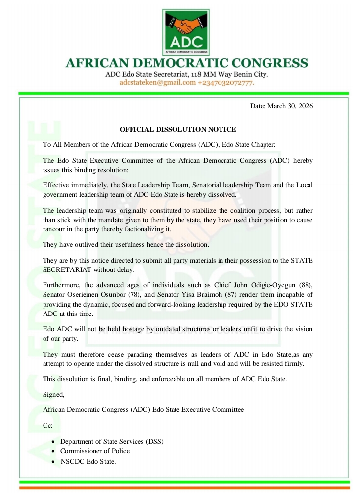 In a dramatic and far-reaching decision, the Edo State chapter of the African Democratic Congress (ADC) has announced the immediate dissolution of its entire leadership structure across all levels, citing deepening internal divisions and loss of direction within the party.