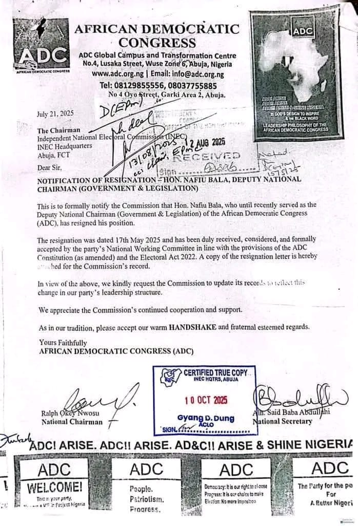 A fresh legal and political storm has intensified within the African Democratic Congress (ADC) following a court action initiated by former party chieftain, Nafiu Bala, who had earlier tendered his resignation from the party’s leadership and INEC acknowledged a copy of the resignation.
