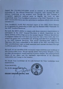According to the letter received by the Office of the Chief Justice of Nigeria on April 28, ADC warned that INEC had already acted based on the lower court judgment by allegedly moving to de-recognize the party’s leadership structure, leaving the party in a dangerous state of uncertainty despite remaining a legally registered political party.