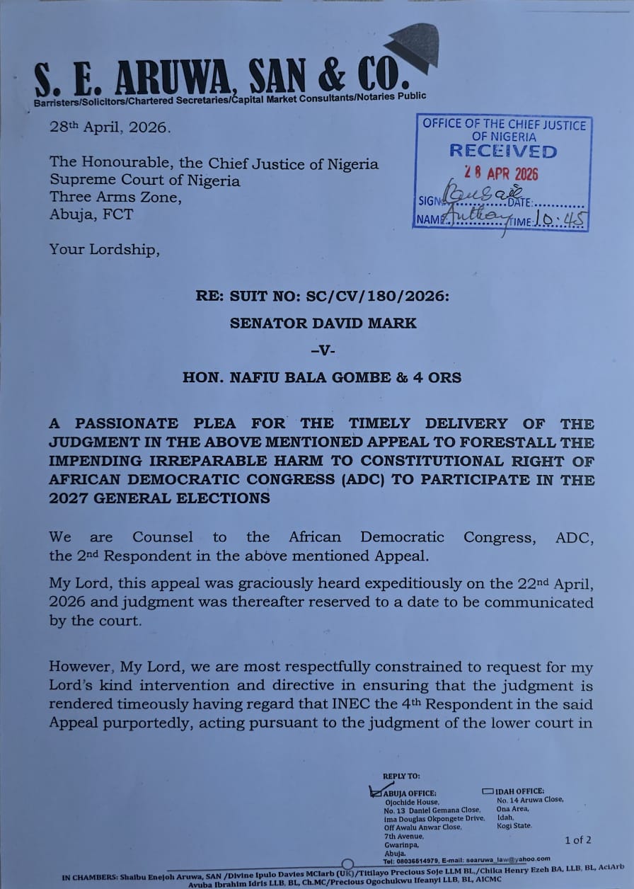 Documents now before the public reveal that the legal team representing ADC, led by Senior Advocate of Nigeria, Shaibu Enejo Aruwa, SAN, has formally written to the Chief Justice of Nigeria, making a passionate plea for the timely delivery of judgment in Suit No. SC/CV/180/2026 involving Senator David Mark versus Hon. Nafiu Bala Gombe & 4 Others.