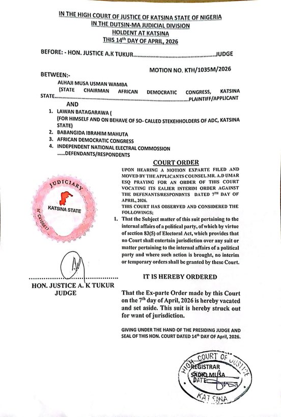 The decision effectively nullifies any legal backing the earlier order may have provided in the ongoing leadership and stakeholder disputes within the ADC in Katsina State.