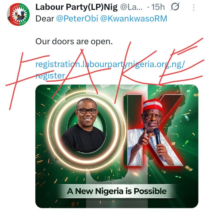 The party specifically raised alarm over a fraudulent account on X operating under the name “LABOUR PARTY (LP) NIG” with the handle @LabourpartyNGR_, describing it as deceptive and misleading. According to the statement, preliminary findings indicate that the account is the same one previously disowned, with its operators merely changing its name and handle to continue impersonation.