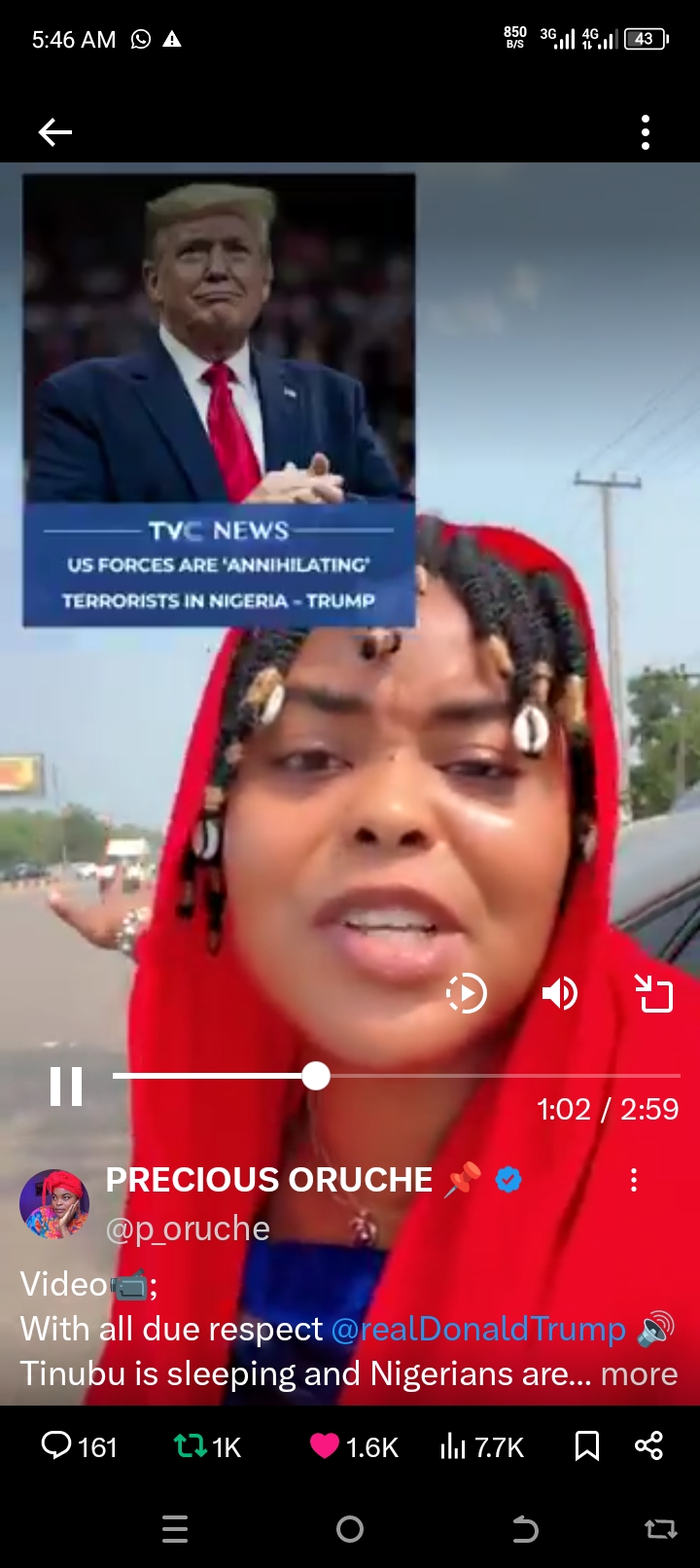 Popular social media influencer Precious Oruche (@p_oruche), widely known as Mama P, has publicly disagreed with former U.S. President Donald Trump’s claim that terrorists have been annihilated in Nigeria, describing the assertion as disconnected from the grim realities on the ground. In a post on X (formerly Twitter), the influencer lamented that the U.S. Secretary of War is not telling President Trump the full truth about the scale and persistence of insecurity across the country.