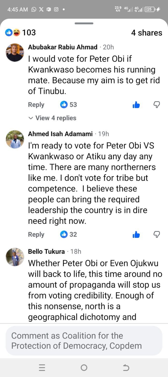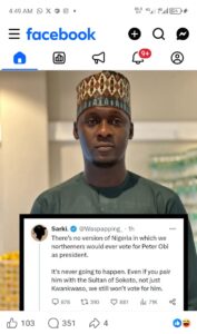 The development follows remarks attributed to social media user Sarki (@Waspaping), who claimed that northerners would never vote for Obi under any circumstance. The statement, which circulated widely after being shared on Facebook, triggered significant backlash from northern users who rejected the sweeping generalization.