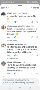 Screenshots attached to the publication reveal numerous responses from young northerners distancing themselves from what they described as divisive and anti-Igbo rhetoric. Many commenters stressed that the region cannot be spoken for as a single political bloc, insisting that voting decisions are increasingly driven by competence, accountability, and national interest rather than ethnicity or regional bias.