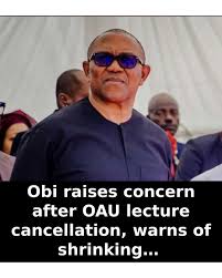 Former Anambra State governor and opposition figure Peter Obi has reportedly encountered a series of lecture cancellations at Nigerian universities, raising concerns about access to public institutions for political figures.
