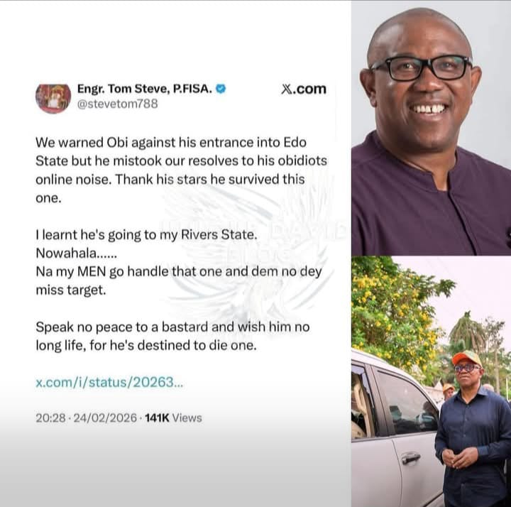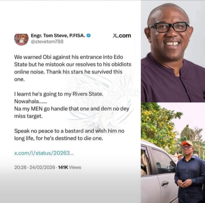Reports circulating online indicate that Engr. Tom Steve (@Stevetom788) has allegedly issued warnings against the planned visit of Peter Obi to Rivers State — a development that is already generating heated political debate.
