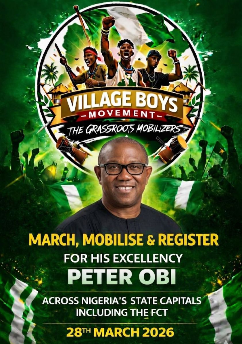 The Village Boys Movement (VBM) has announced plans to mobilise supporters across Nigeria in a major political campaign tagged the “2 Million Man March and ADC Registration Drive” in support of Peter Obi ahead of the 2027 general elections.